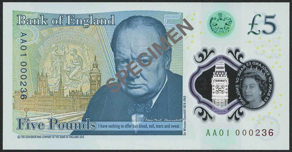 Bank of England, Victoria Cleland, £5 (2), ND (2016), serial number AA01 000236/238, printed on polymer, blue on green, Queen Elizabeth II at right, Bank of England building at low centre, see-through window security feature with metallic foil of Elizabeth Tower and clearly defined portrait of Queen Elizabeth II at left, reverse, Winston Churchill at centre, Houses of Parliament at left