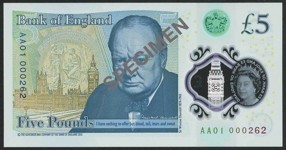 Bank of England, Victoria Cleland, £5 (2), ND (2016), serial number AA01 000262/263, printed on polymer, blue on green, Queen Elizabeth II at right, Bank of England building at low centre, see-through window security feature with metallic foil of Elizabeth Tower and clearly defined portrait of Queen Elizabeth II at left, reverse, Winston Churchill at centre, Houses of Parliament at left