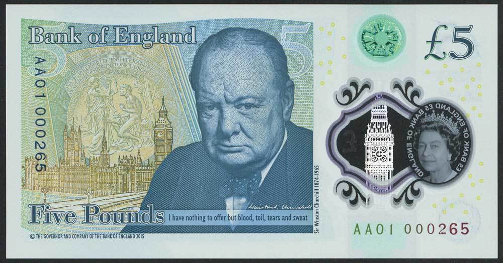 Bank of England, Victoria Cleland, £5 (2), ND (2016), serial number AA01 000265/266, printed on polymer, blue on green, Queen Elizabeth II at right, Bank of England building at low centre, see-through window security feature with metallic foil of Elizabeth Tower and clearly defined portrait of Queen Elizabeth II at left, reverse, Winston Churchill at centre, Houses of Parliament at left