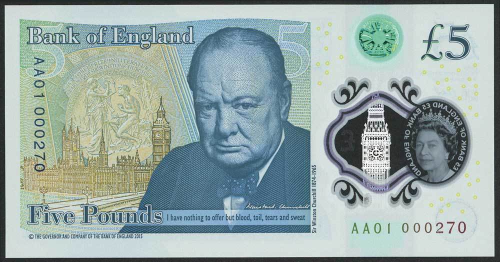 Bank of England, Victoria Cleland, £5, ND (2016), serial number AA01 000270, printed on polymer, blue on green, Queen Elizabeth II at right, Bank of England building at low centre, see-through window security feature with metallic foil of Elizabeth Tower and clearly defined portrait of Queen Elizabeth II at left, reverse, Winston Churchill at centre, Houses of Parliament at left