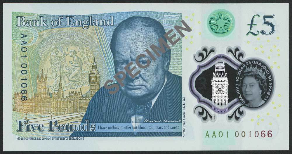 Bank of England, Victoria Cleland, £5, ND (2016), serial number AA01 001066, printed on polymer, blue on green, Queen Elizabeth II at right, Bank of England building at low centre, see-through window security feature with metallic foil of Elizabeth Tower and clearly defined portrait of Queen Elizabeth II at left, reverse, Winston Churchill at centre, Houses of Parliament at left