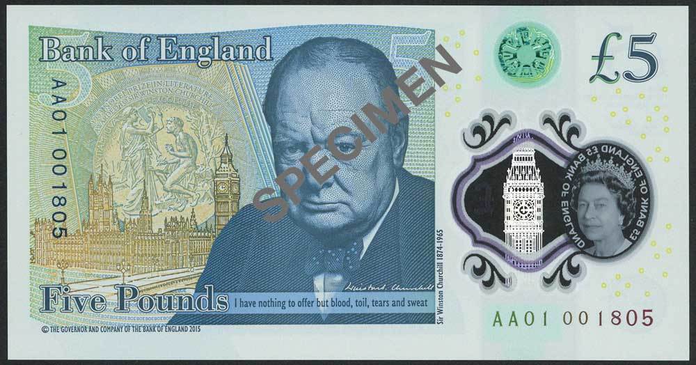 Bank of England, Victoria Cleland, £5 (2), ND (2016), serial number AA01 001805/1815, printed on polymer, blue on green, Queen Elizabeth II at right, Bank of England building at low centre, see-through window security feature with metallic foil of Elizabeth Tower and clearly defined portrait of Queen Elizabeth II at left, reverse, Winston Churchill at centre, Houses of Parliament at left