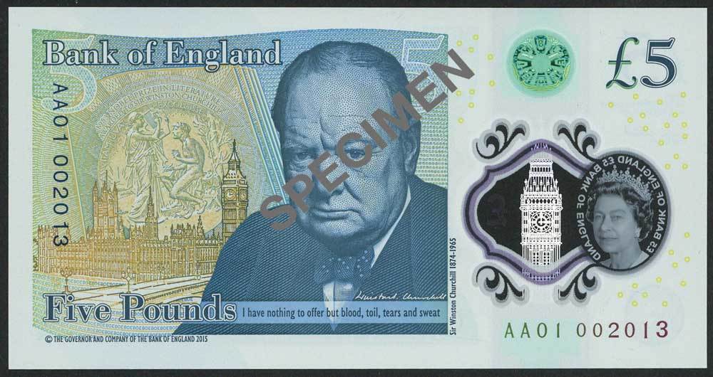 Bank of England, Victoria Cleland, £5 (3), ND (2016), serial number AA01 002013/2014/2015, printed on polymer, blue on green, Queen Elizabeth II at right, Bank of England building at low centre, see-through window security feature with metallic foil of Elizabeth Tower and clearly defined portrait of Queen Elizabeth II at left, reverse, Winston Churchill at centre, Houses of Parliament at left