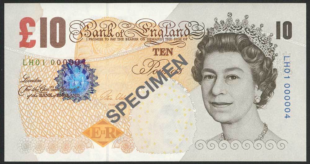 Bank of England, Victoria Cleland, £10, ND (2014), serial number LH01 000004, pale orange-brown, Queen Elizabeth II at right, Britannia and value in foil hologram at left, reverse brown and multicoloured, Charles Darwin at right, humming bird and flowers at left