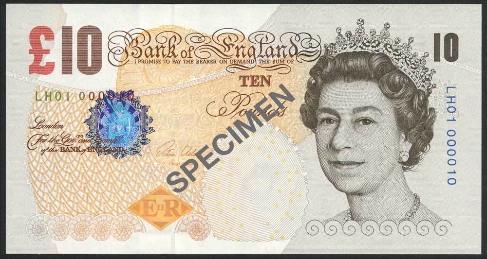 Bank of England, Victoria Cleland, £10, ND (2014), serial number LH01 000010, pale orange-brown, Queen Elizabeth II at right, Britannia and value in foil hologram at left, reverse brown and multicoloured, Charles Darwin at right, humming bird and flowers at left
