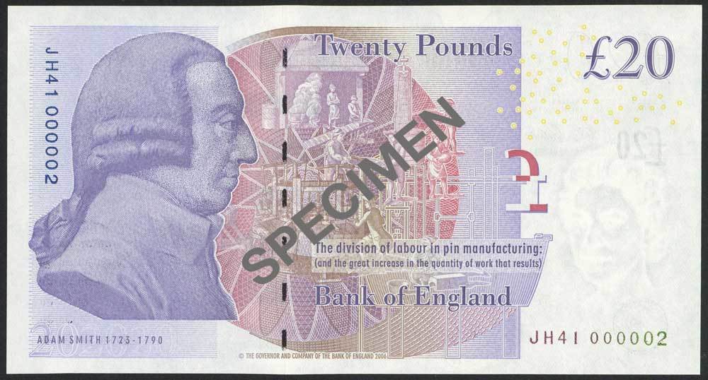 Bank of England, Victoria Cleland, £20, ND (2014), serial number JH41 000002, purple and white, Queen Elizabeth II at right, Bank of England building low centre, value top left and right and low right, Britannia at low left and holographic strip left centre with value and profile of Adam Smith, reverse purple, Adam Smith left, pin manufacturing scene at centre