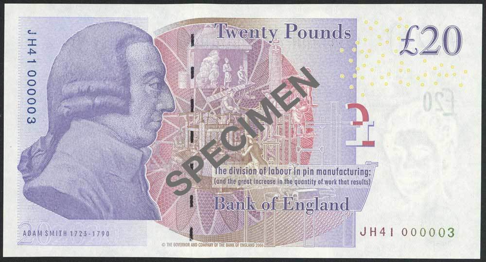 Bank of England, Victoria Cleland, £20, ND (2014), serial number JH41 000003, purple and white, Queen Elizabeth II at right, Bank of England building low centre, value top left and right and low right, Britannia at low left and holographic strip left centre with value and profile of Adam Smith, reverse purple, Adam Smith left, pin manufacturing scene at centre