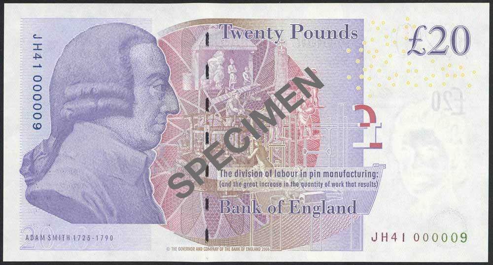 Bank of England, Victoria Cleland, £20, ND (2014), serial number JH41 000009, purple and white, Queen Elizabeth II at right, Bank of England building low centre, value top left and right and low right, Britannia at low left and holographic strip left centre with value and profile of Adam Smith, reverse purple, Adam Smith left, pin manufacturing scene at centre