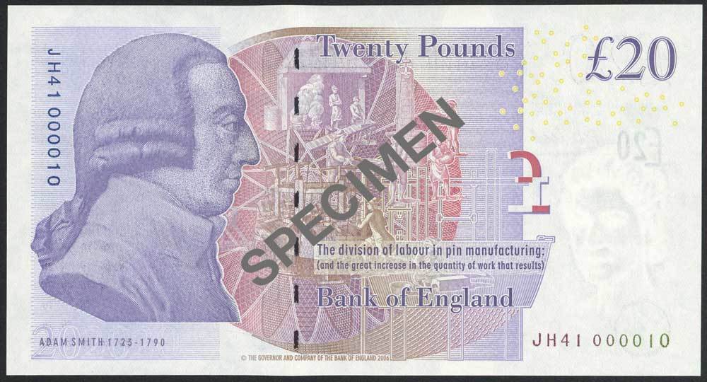 Bank of England, Victoria Cleland, £20, ND (2014), serial number JH41 000010, purple and white, Queen Elizabeth II at right, Bank of England building low centre, value top left and right and low right, Britannia at low left and holographic strip left centre with value and profile of Adam Smith, reverse purple, Adam Smith left, pin manufacturing scene at centre