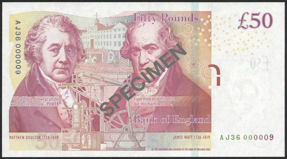 Bank of England, Victoria Cleland, £50, ND (2014), serial number AJ36 000009, red and white, Queen Elizabeth II at right, Bank of England building low centre, value top left and right and low right, Britannia low left, green motion thread left centre, reverse red and white, Matthew Boulton and James Watt at left, Soho Manufactory in background, Whitbread Steam Engine in foreground