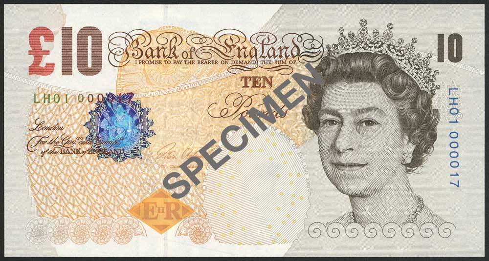 Bank of England, Victoria Cleland, £10 (2), ND (2014), serial number LH01 000017/18, pale orange-brown, Queen Elizabeth II at right, Britannia and value in foil hologram at left, reverse brown and multicoloured, Charles Darwin at right, humming bird and flowers at left