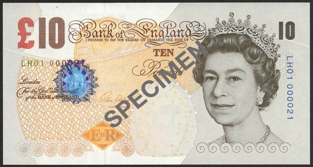 Bank of England, Victoria Cleland, £10 (2), ND (2014), serial number LH01 000021/22, pale orange-brown, Queen Elizabeth II at right, Britannia and value in foil hologram at left, reverse brown and multicoloured, Charles Darwin at right, humming bird and flowers at left