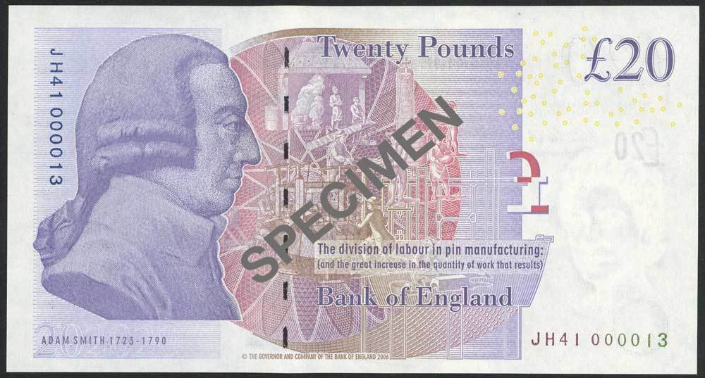 Bank of England, Victoria Cleland, £20 (2), ND (2014), serial number JH41 000013/14, purple and white, Queen Elizabeth II at right, Bank of England building low centre, value top left and right and low right, Britannia at low left and holographic strip left centre with value and profile of Adam Smith, reverse purple, Adam Smith left, pin manufacturing scene at centre