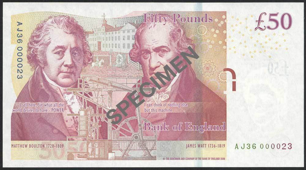Bank of England, Victoria Cleland, £50 (2), ND (2014), serial number AJ36 000023/24, red and white, Queen Elizabeth II at right, Bank of England building low centre, value top left and right and low right, Britannia low left, green motion thread left centre, reverse red and white, Matthew Boulton and James Watt at left, Soho Manufactory in background, Whitbread Steam Engine in foreground