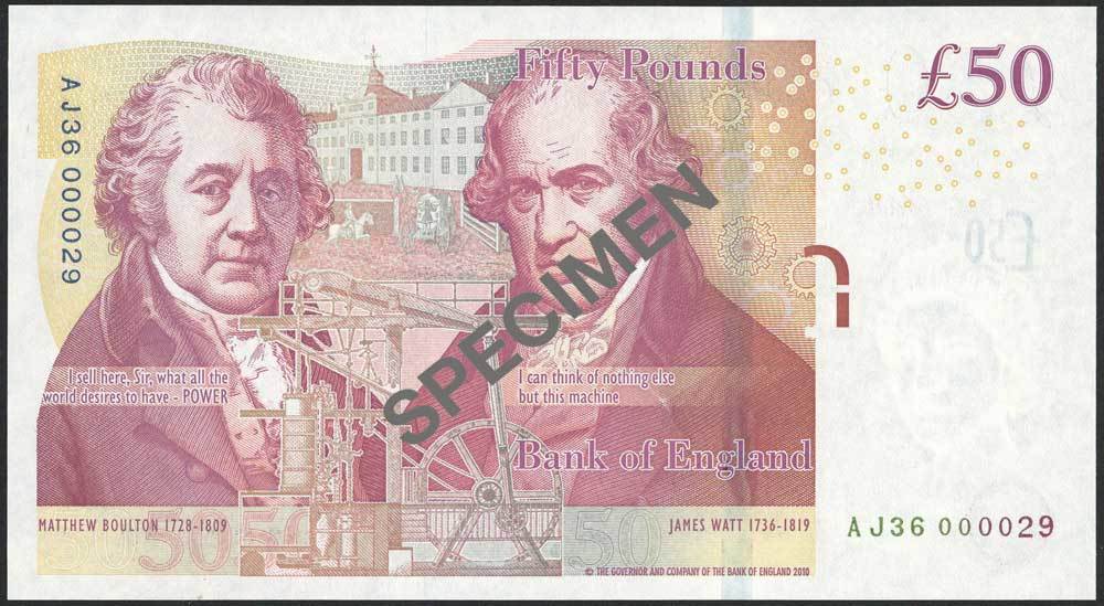Bank of England, Victoria Cleland, £50 (2), ND (2014), serial number AJ36 000029/30, red and white, Queen Elizabeth II at right, Bank of England building low centre, value top left and right and low right, Britannia low left, green motion thread left centre, reverse red and white, Matthew Boulton and James Watt at left, Soho Manufactory in background, Whitbread Steam Engine in foreground