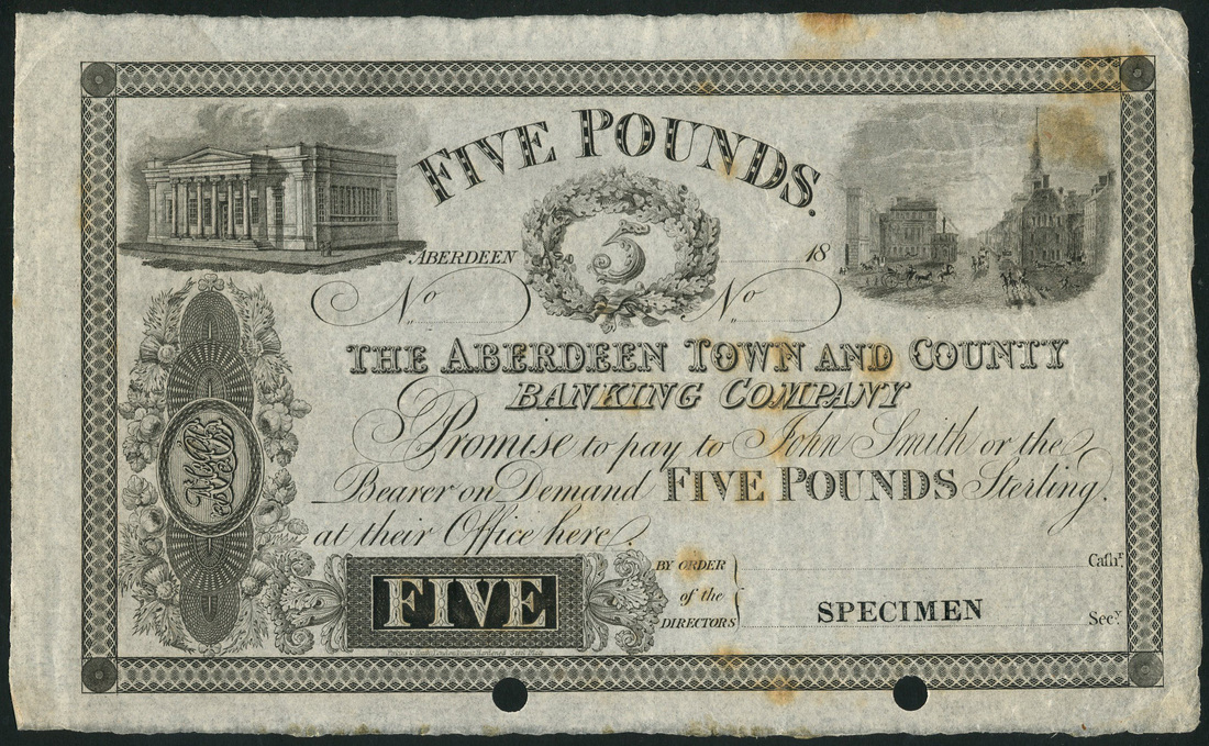 Aberdeen Town & Country Banking Company, specimen £5, 18- (ca 1825), black and white, Head Office top left, Union Street, Aberdeen, top right, value laureate top centre, bank initials at left, 'pay to John Smith or the bearer' in text at centre