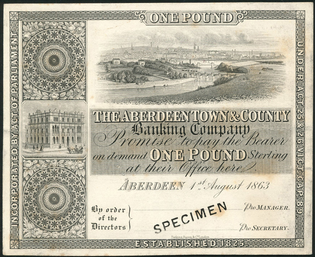 Aberdeen Town & Country Banking Company, specimen £1 on card, 1 August 1863, black and white, view of Aberdeen top right, bank building at left