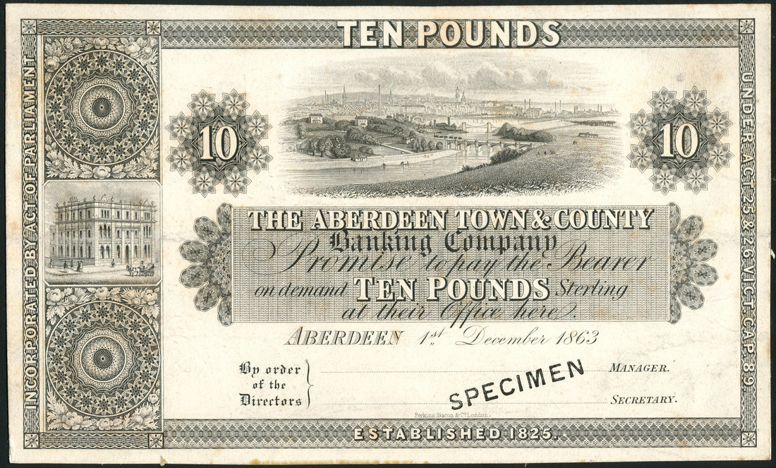 Aberdeen Town & Country Banking Company, specimen £10 on card, 1 December 1863, black and white, view of Aberdeen top right, bank building at left