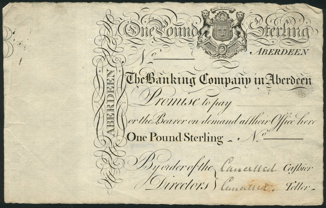 The Banking Company in Aberdeen, unissued £1, ND (ca 1780), no serial number, black and white, arms top centre dividing ONE POUND-STERLING, ABERDEEN top right and at left, watermarked paper, manuscript 'Cancelled' twice low right