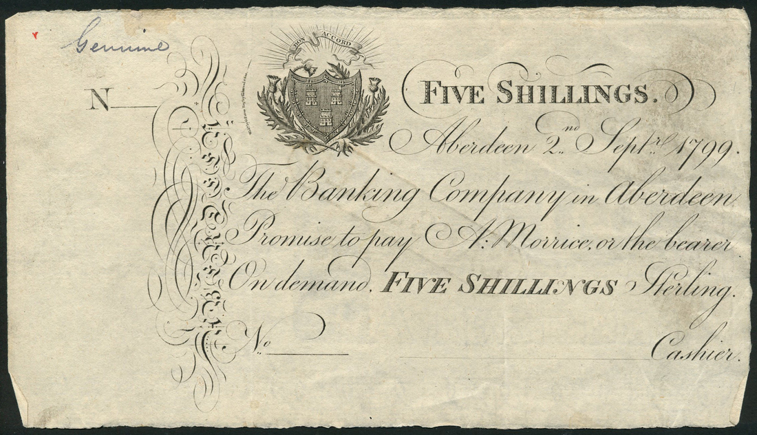 The Banking Company in Aberdeen, unissued 5/-, 2 September 1799, no serial number, black and white, arms top left, FIVE SHILLINGS top right, in text at centre 'promise to pay A.Morrice or the bearer'