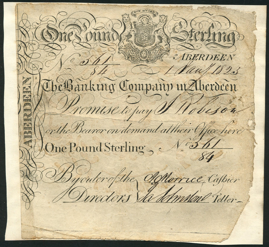 The Banking Company in Aberdeen, contemporary forgery £1, 1 January 1825, serial number 361/84, black and white, arms top centre, ONE POUND top left, STERLING top right, 'Promise to pay to J.Robson or the bearer' in text at centre, two manuscript signatures low right