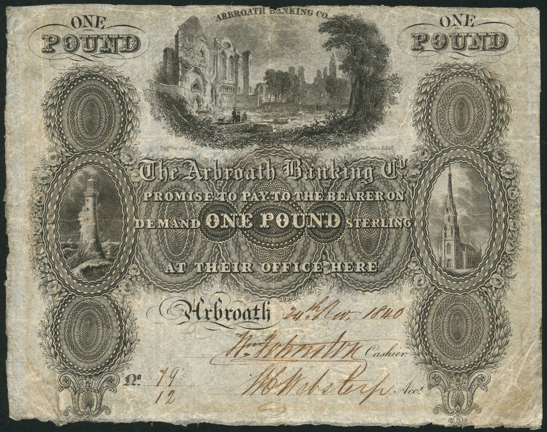 The Arbroath Banking Limited, £1, 24 November 1840, serial number 79/12, black and white, Arbroath abbey top centre, the Bell Rock lighthouse at left in oval frame, two manuscript signatures low right