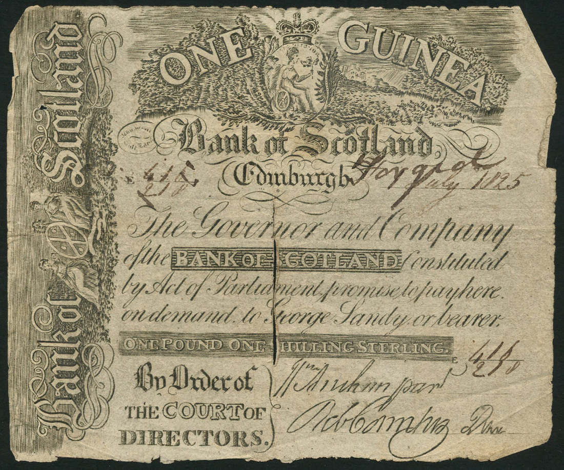 Bank of Scotland, 1 guinea (2), 1 May 1823, 1 July 1825, black and white, crowned vignette of Scotia top centre, bank title and maidens at left, 'pay to George Sandy or bearer' in text at centre, two signatures low right