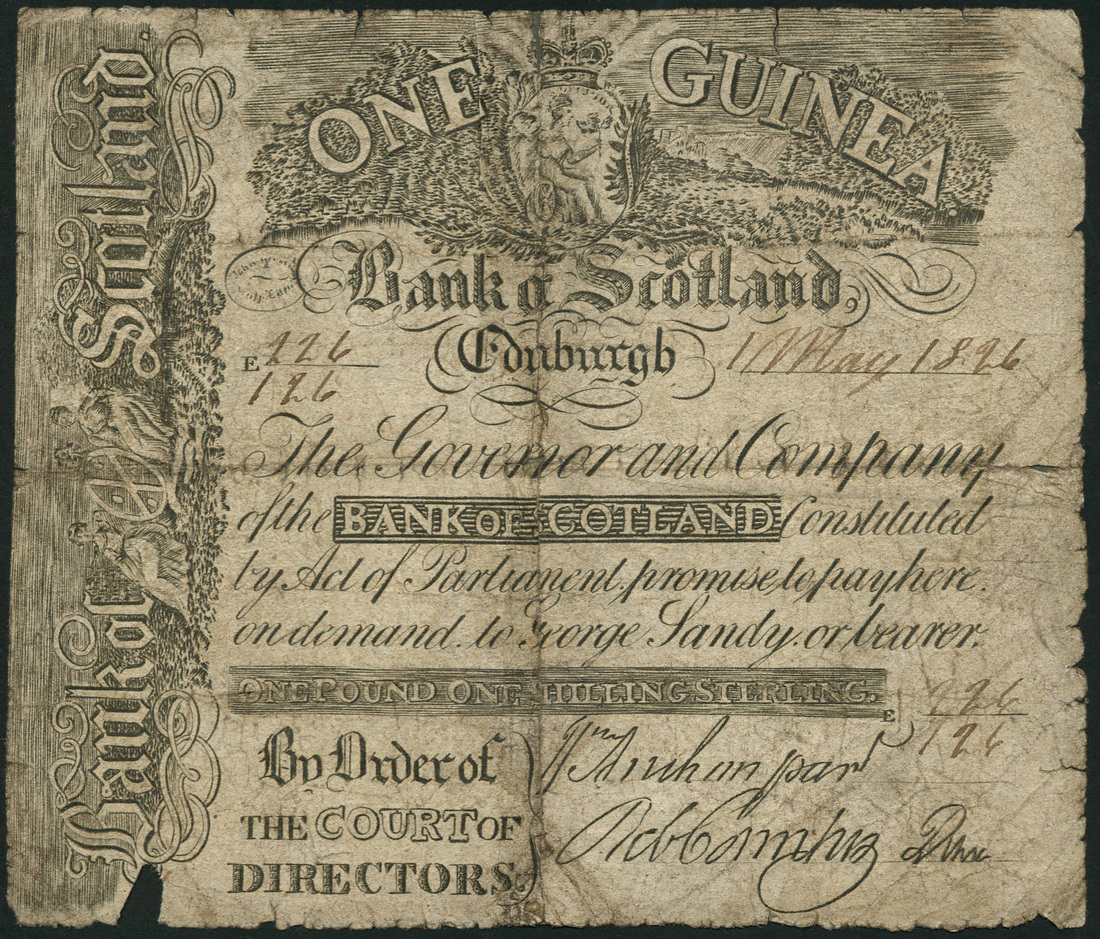 Bank of Scotland, 1 guinea, 1 May 1826, serial number E226/126, black and white, crowned vignette of Scotia top centre, bank title and maidens at left, 'pay to George Sandy or bearer' in text at centre, two signatures low right