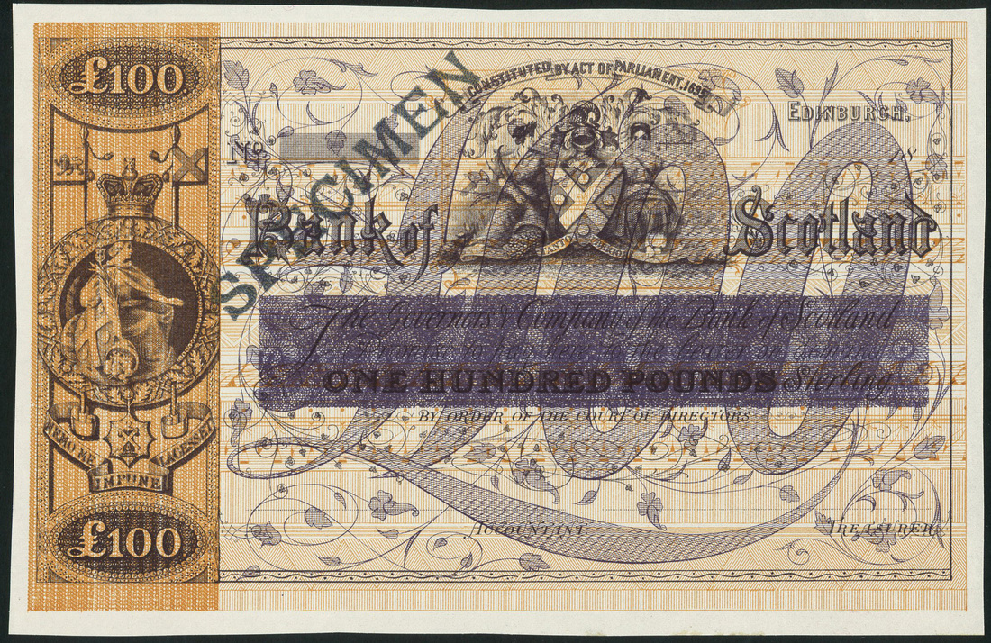 Bank of Scotland, experimental proof £100, 18- (ca 1880), orange, violet and pale pink-orange, arms flanked by maidens top centre crowned vignette of Scotia at left centre, value in ornate blue script at centre, value top left and low right