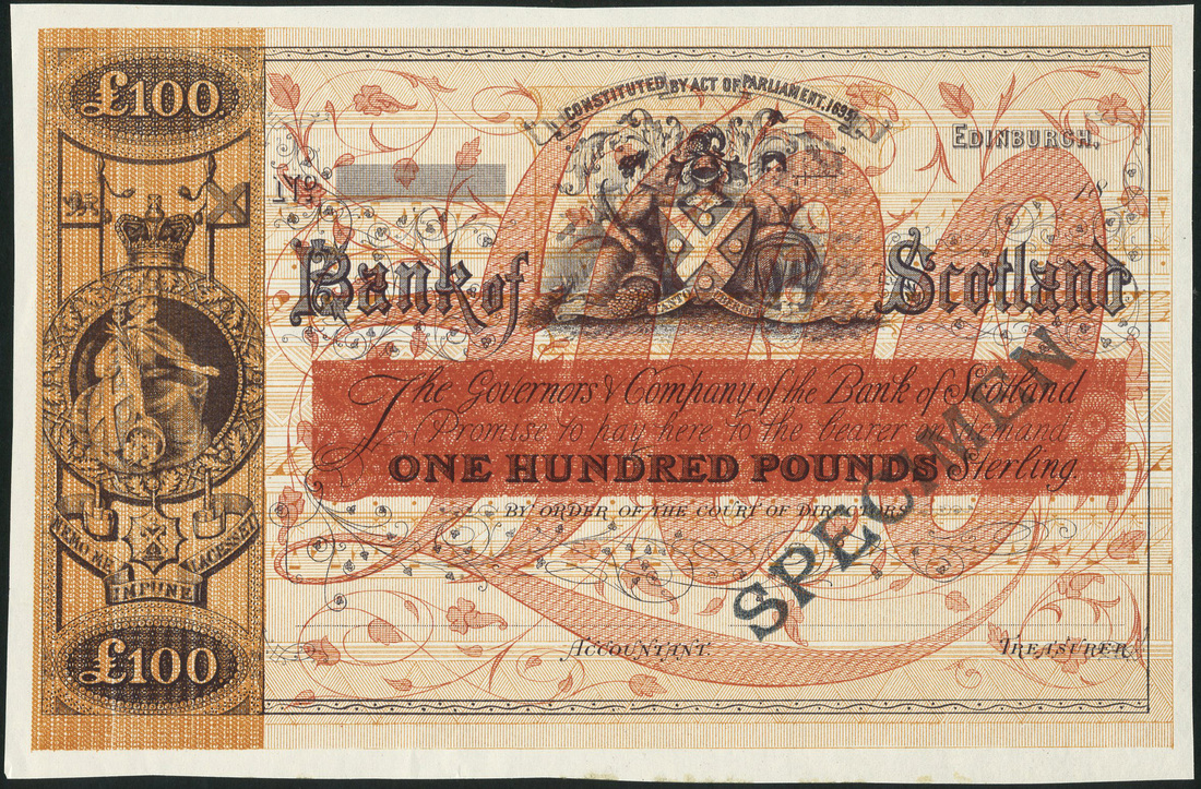 Bank of Scotland, experimental proof £100, 18- (ca 1880), orange, red and pale pink-orange, arms flanked by maidens top centre crowned vignette of Scotia at left centre, value in ornate red script at centre, value top left and low right