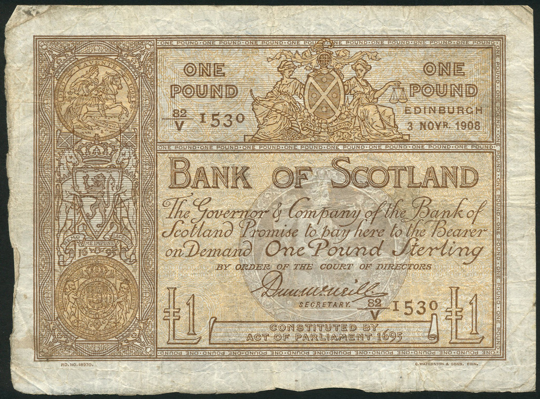 Bank of Scotland, £1, 3 November 1908, serial number 82/V 1530, pale orange-brown and white, arms flanked by maidens top centre, arms at left, Great Seal of Scotland in vertical panel at left, Scotia in circular grey frame at centre, printed signature of Duncan McNeill low centre