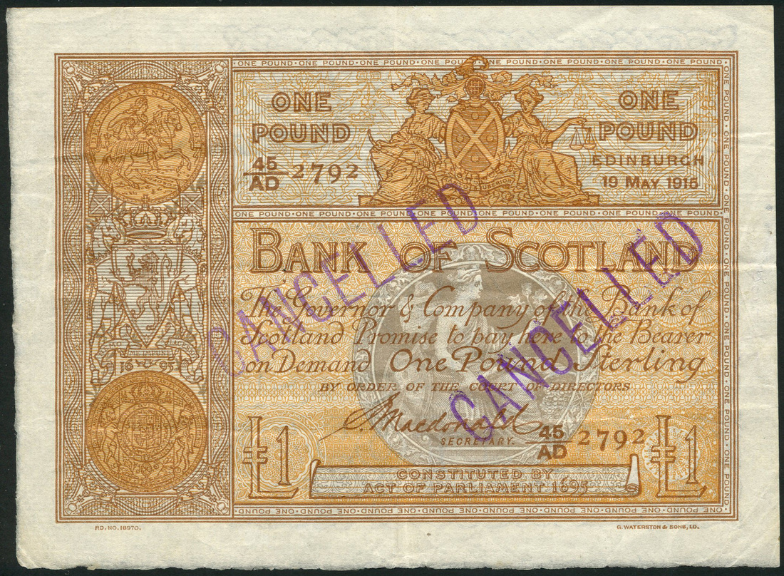 Bank of Scotland, £1, 19 May 1915, serial number 45/AD 2792, pale orange-brown and white, arms flanked by maidens top centre, arms at left, Great Seal of Scotland in vertical panel at left, Scotia in circular grey frame at centre, printed signature of Peter Macdonald low centre