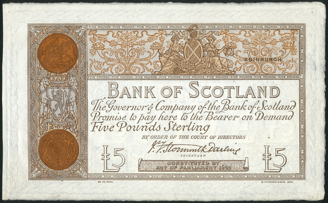 Bank of Scotland, proof £5, ND (ca 1885), pale orange-brown and white, arms flanked by maidens top centre, arms at left, Great Seal of Scotland in vertical panel at left, printed signature of Stormonth Darling low centre