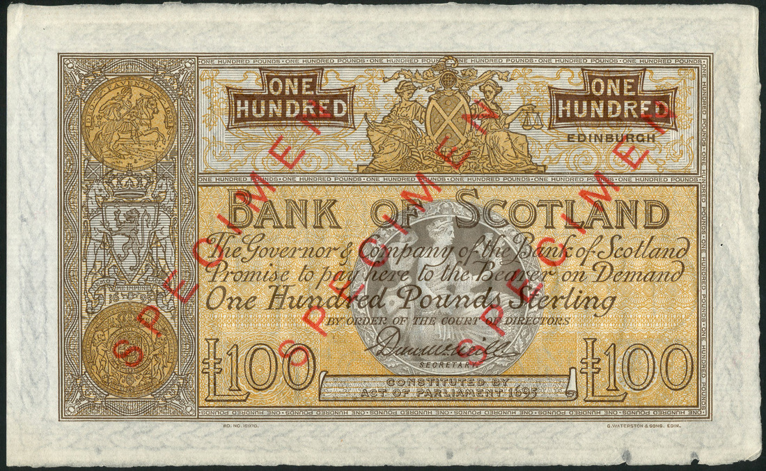 (Douglas 80a-4), a G.Waterston & Sons Edin. printing, three red SPECIMEN handstamps in field, two nicks at low right border otherwise about extremely fine and very rare, only 20 examples printed, a striking note