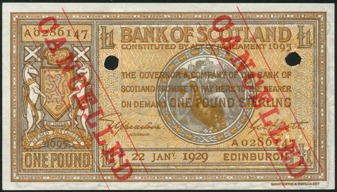 Bank of Scotland, £1, 22 January 1929, serial number A 0286147, orange-brown, arms and unicorns at left, Scotia in circular grey panel right centre, Elphinstone and Scott signatures, reverse grey, the Head Office building at centre