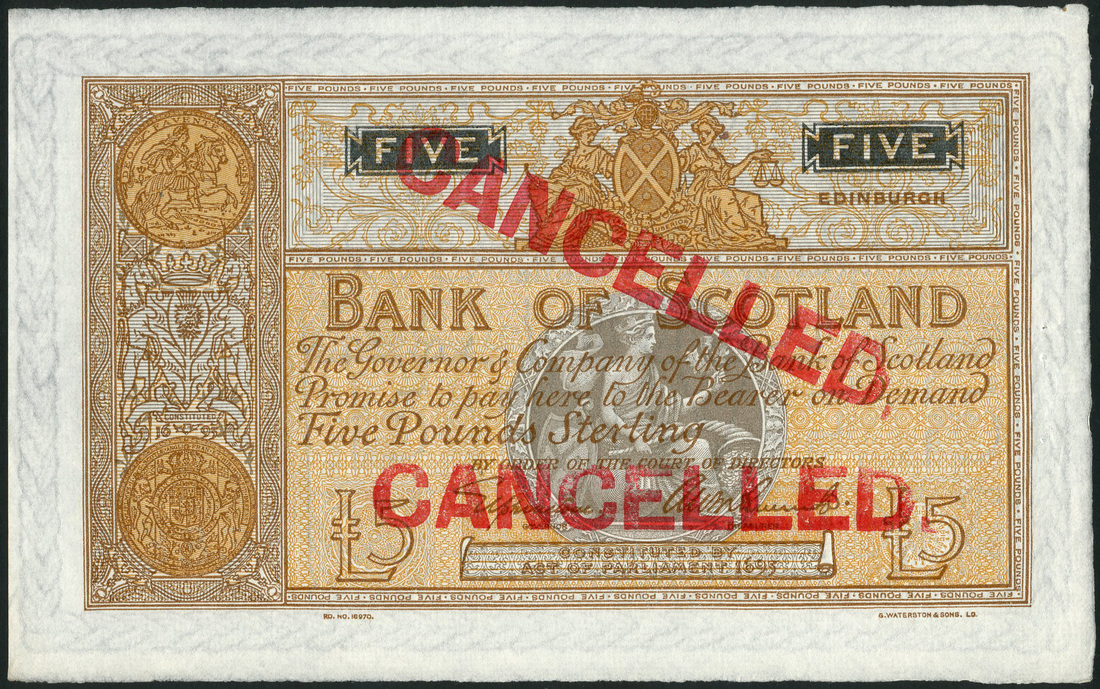 Bank of Scotland, specimen £5, ND (1935), no serial numbers, orange-brown, arms and unicorns at left in grey, Great Seal of Scotland, Scotia in circular grey panel right centre, Elphinstone and Beveridge signatures, reverse blank
