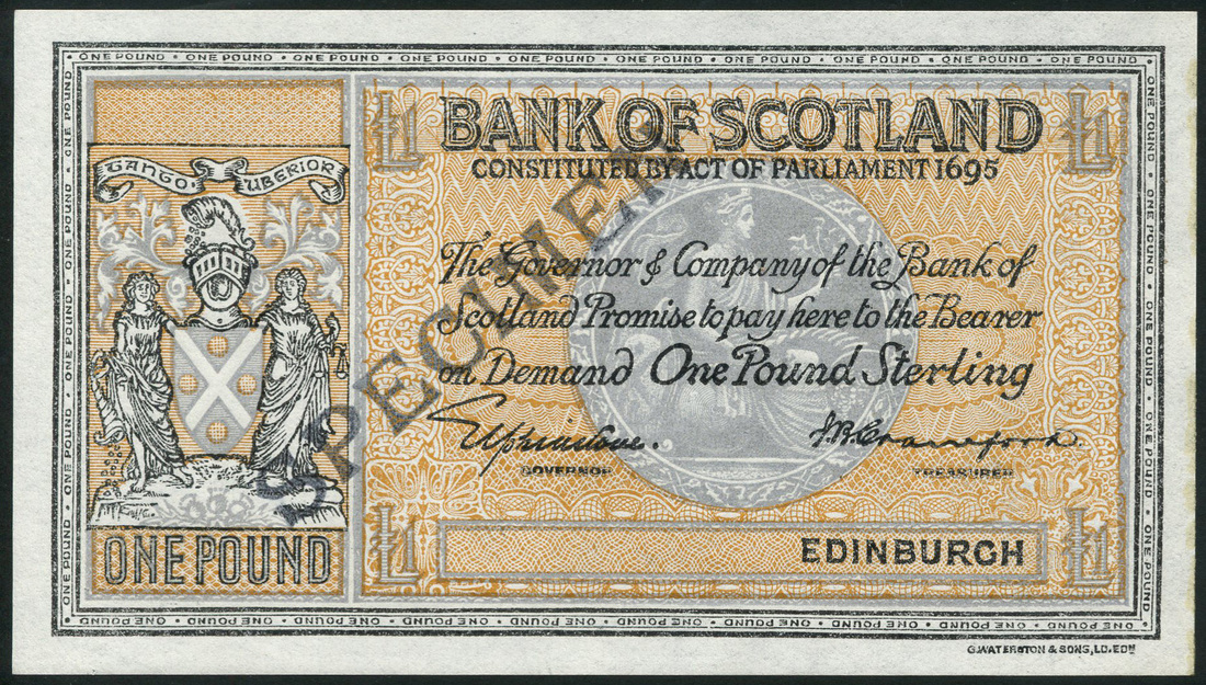 Bank of Scotland, trial £1, ND (1942), orange-brown, arms and maidens at left in grey, Scotia in circular pale grey panel right centre, Elphinstone and Crawford signatures, reverse blank