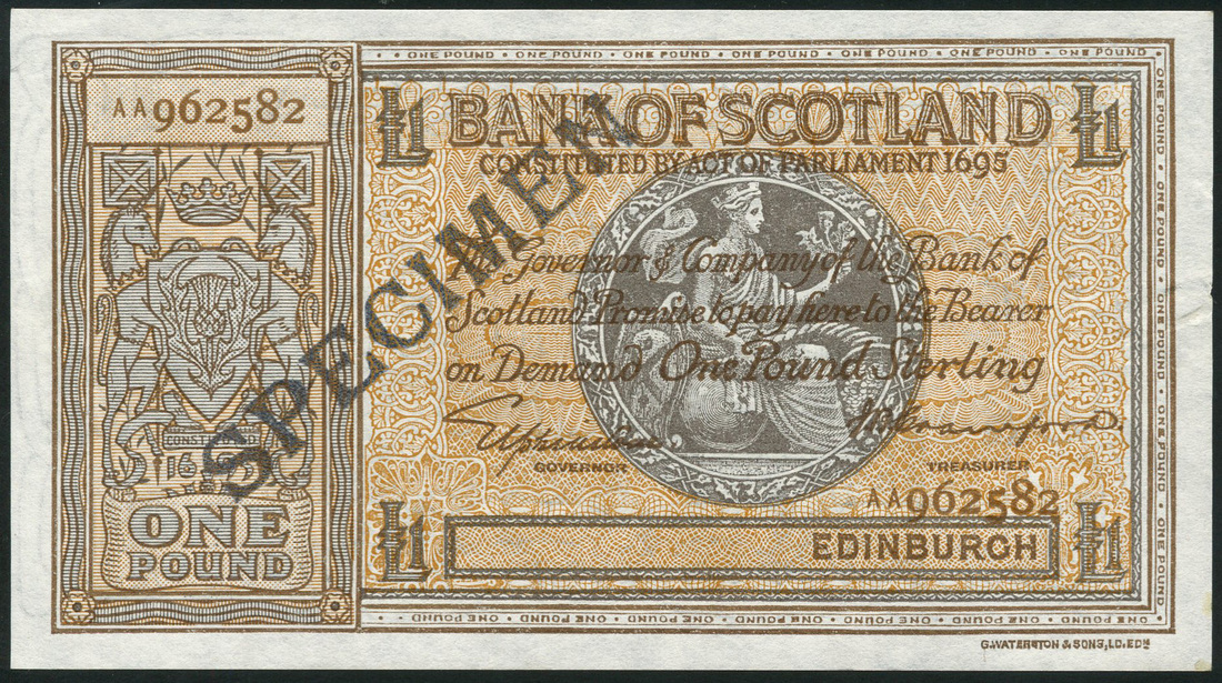 Bank of Scotland, trial £1, ND (1942), serial number AA 962582, orange-brown, arms and unicorns at left in grey, Scotia in circular grey panel right centre, Elphinstone and Crawford signatures, reverse the Bank Head Office at centre, arms at left and right