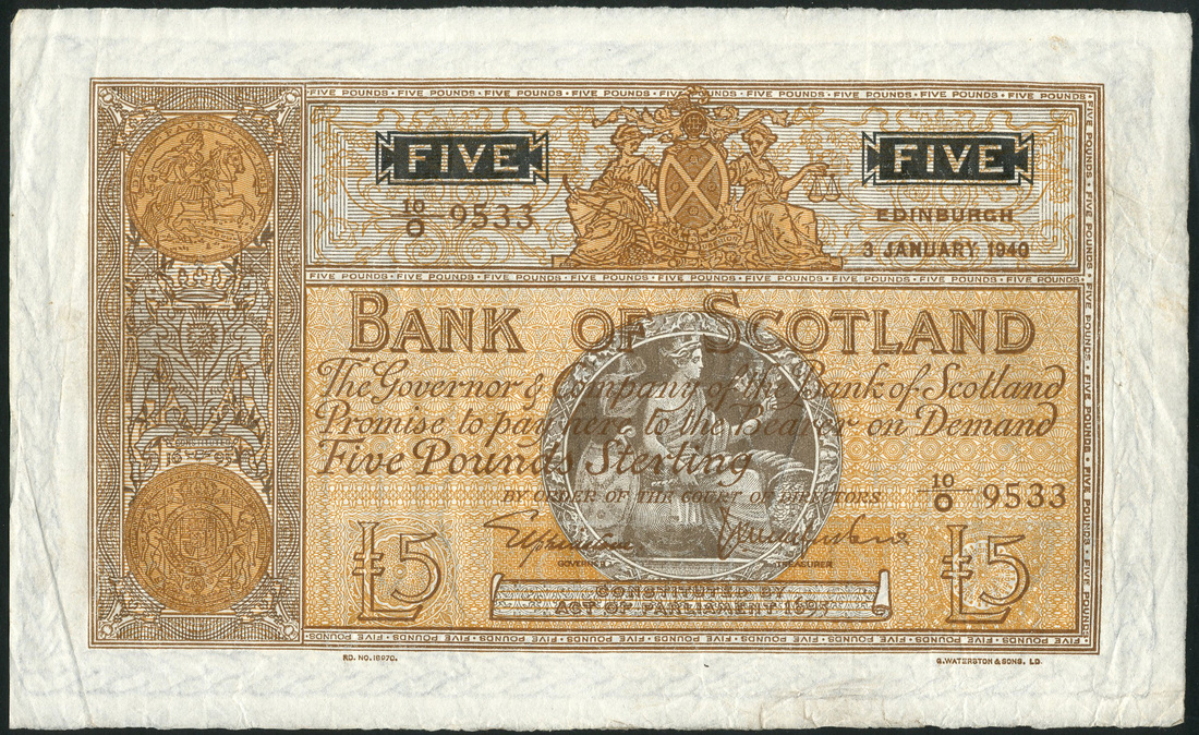 Bank of Scotland, £5, 3 January 1940, serial number 10/O 9533, orange-brown, arms, unicorns and Great Seal of Scotland at left, Scotia in circular grey panel right centre, Elphinstone and Macfarlane signatures
