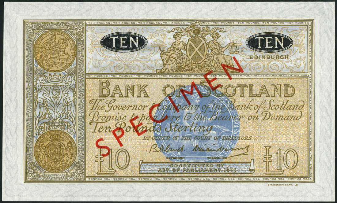 Bank of Scotland, £10, ND (1963), no serial number, orange-brown, Scotia in circular blue panel at centre, Bilsland and Watson signatures, value in black tablets top left and right, thistle motif in panel at left
