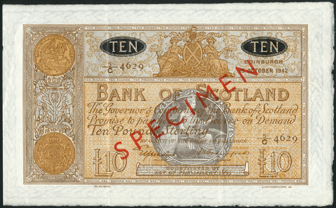 Bank of Scotland, £10, 15 October 1942, 5/C 4629, orange-brown, arms and unicorns at left in grey, Great Seal of Scotland, Scotia in circular grey panel right centre, Elphinstone and Crawford signatures, reverse blank