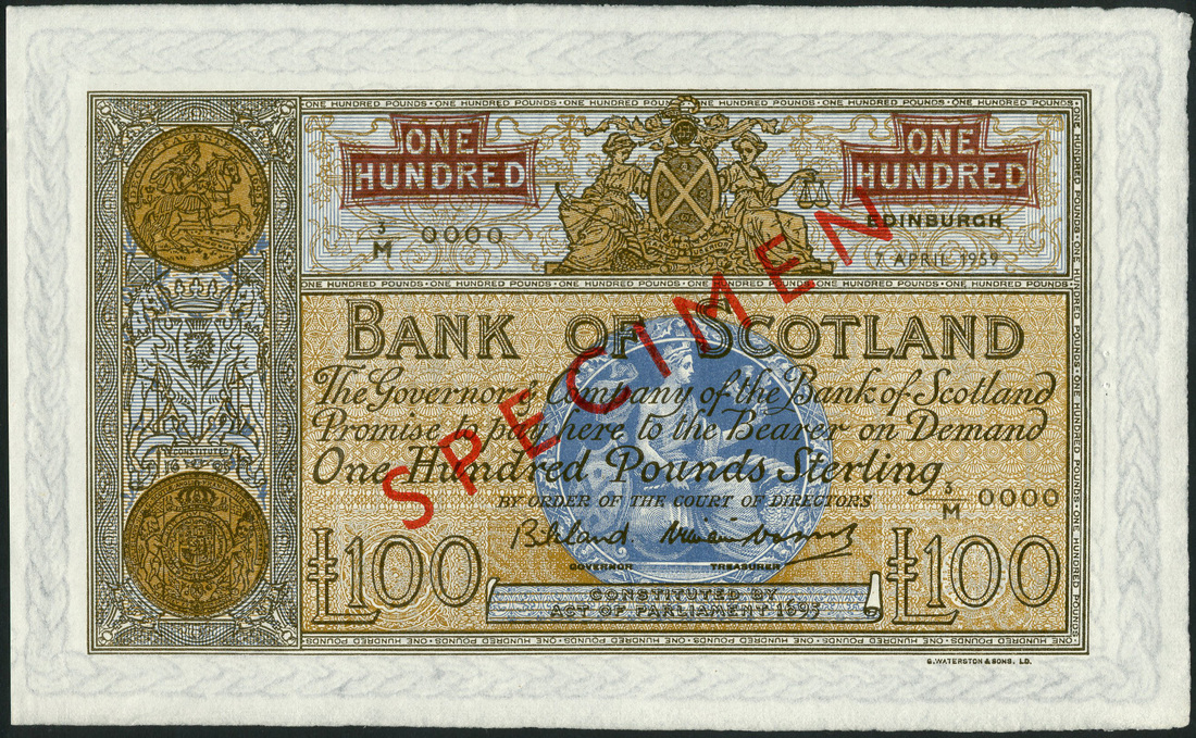 Bank of Scotland, specimen £100, 7 April 1959, serial number 3/M 0000, orange-brown, arms and unicorns at left in grey and pale blue, Great Seal of Scotland, Scotia in circular blue panel right centre, Bilsland and Watson signatures, reverse blank