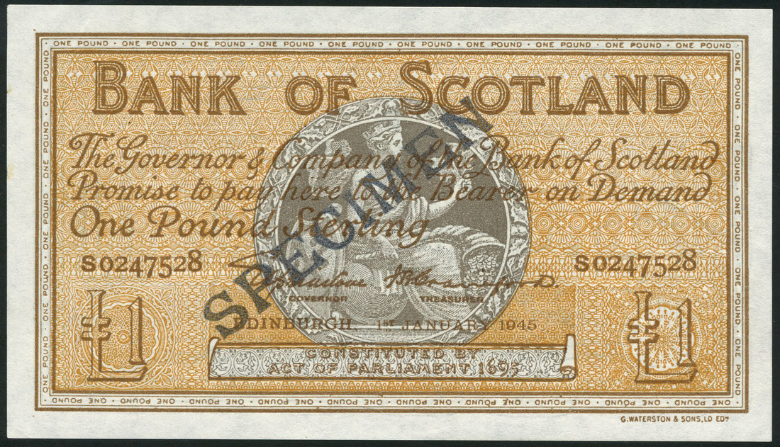 Bank of Scotland, trial £1, 1 January 1945, serial number S 0247528, orange-brown, Scotia in circular grey panel at centre, Elphinstone and Crawford signatures, reverse green, arms at centre, value at left and right