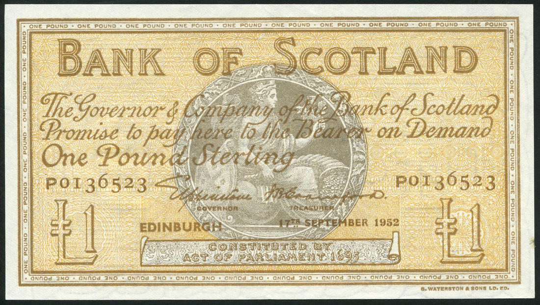 Bank of Scotland, £1, 17 September 1952, serial number P 0136523, orange-brown, Scotia in circular grey panel at centre, Elphinstone and Crawford signatures, reverse brown, arms at centre, value at left and right