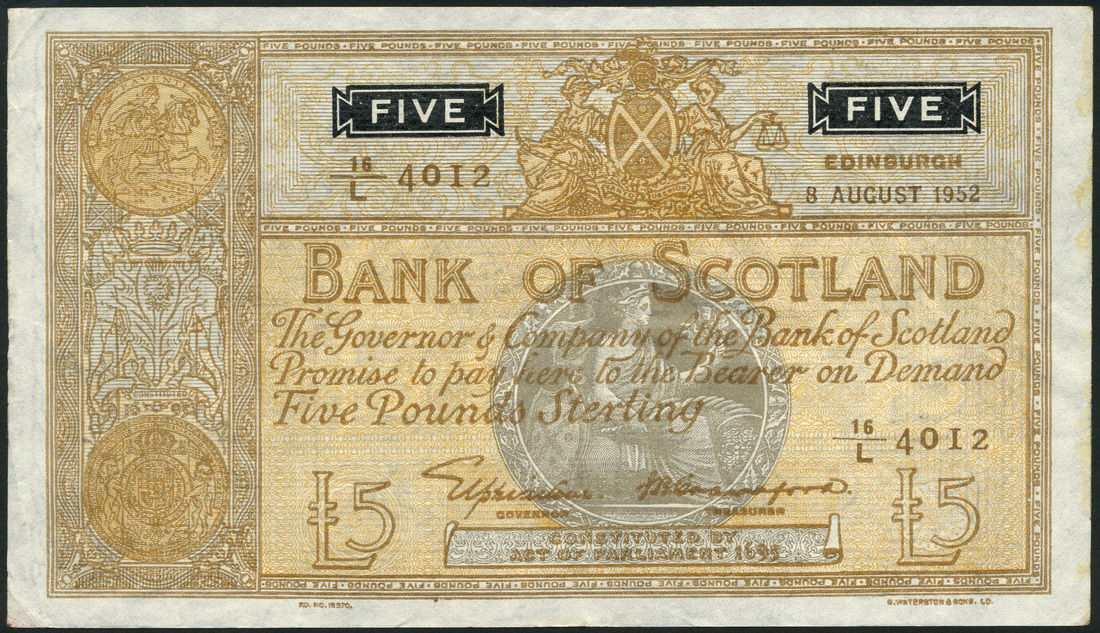 Bank of Scotland, £5, 8 August 1952, serial number 16/L 4012, orange-brown, arms and unicorns at left in grey, Great Seal of Scotland, Scotia in circular grey panel right centre, Elphinstone and Crawford signatures, reverse brown, arms at centre, value at left and right