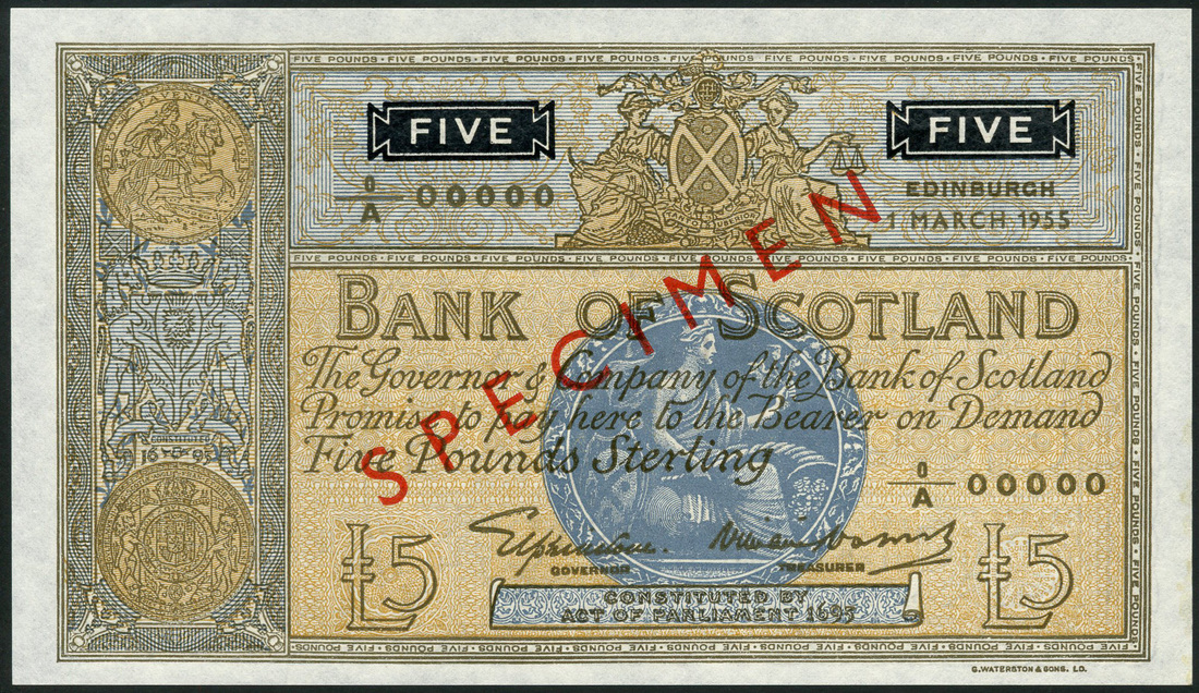 Bank of Scotland, specimen £5, 1 March 1955, serial number 0/A 00000, orange-brown, arms and unicorns at left, Great Seal of Scotland, Scotia in circular blue panel at centre, Elphinstone and Watson signatures, value in black panel top left and right, reverse brown, arms at centre and at left, ship at right, value at each corner