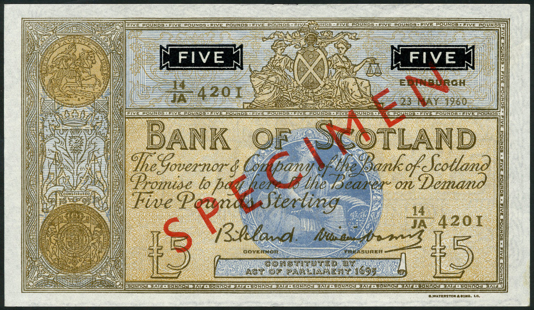 Bank of Scotland, £5, 23 May 1960, serial number 14/JA 4201, orange-brown, Scotia in circular blue panel at centre, Bilsland and Watson signatures, value in black tablets top left and right, reverse brown, bank's shield at centre flanked by arms at left and ship at right both in circular panels, value in each corner