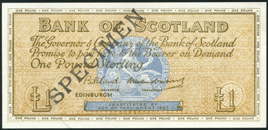 Bank of Scotland, £1 (2), ND and 30 November 1960, second with serial number B/A 0000000, orange-brown, Scotia in circular blue panel at centre, Bilsland and Watson signatures, reverse, brown, ship emblem at centre flanked by thistles, first with reduced size medallion on thicker paper, second with modified border