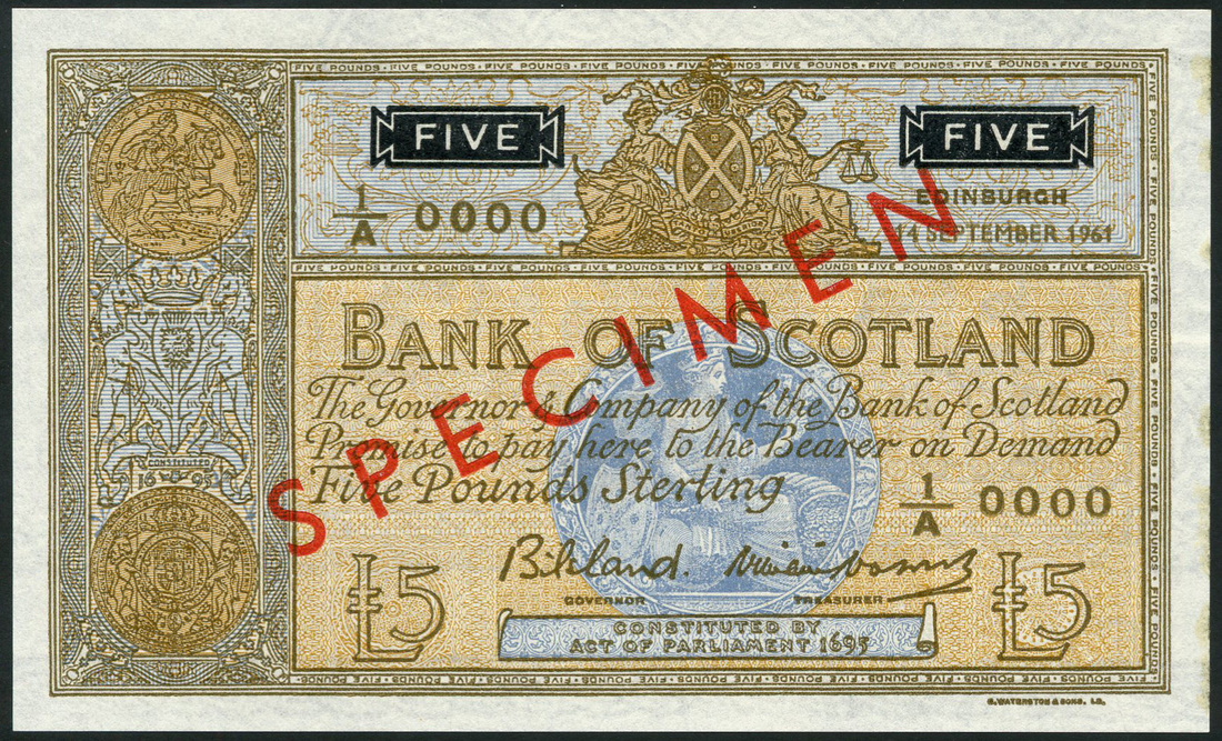 Bank of Scotland, specimen £5, 14 September 1961, serial number 1/A 0000, orange brown, bank arms top centre flanked by value in black tablets, Scotia in blue circular panel at centre, thistle motif at left, Bilsland and Watson signatures, reverse, shield flanked by arms and ship in ornate circular panels
