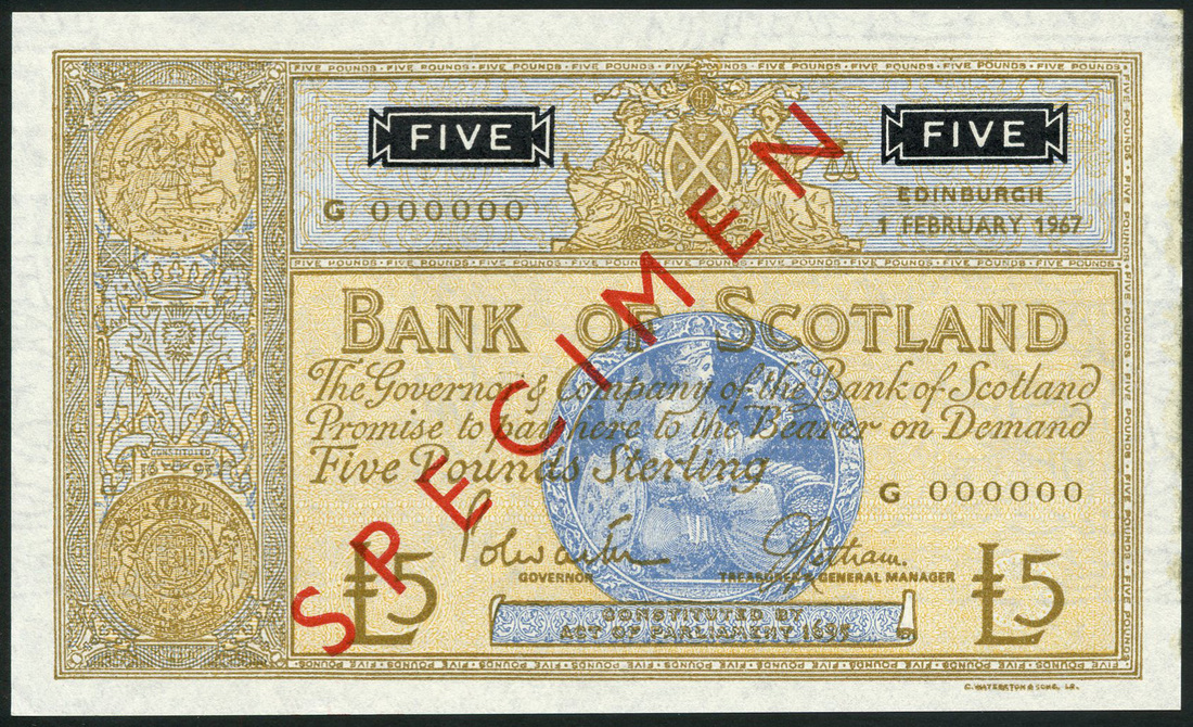 Bank of Scotland, £1, I June 1966, serial number A/P 0000000, yellow-brown, pale blue Scotia seal at centre, Polwarth and Letham signatures, reverse brown, ship at centre and arms, also a specimen £5, 1 February 1967, serial number G 000000, yellow-brown and pale blue, Polwarth and Letham signatures